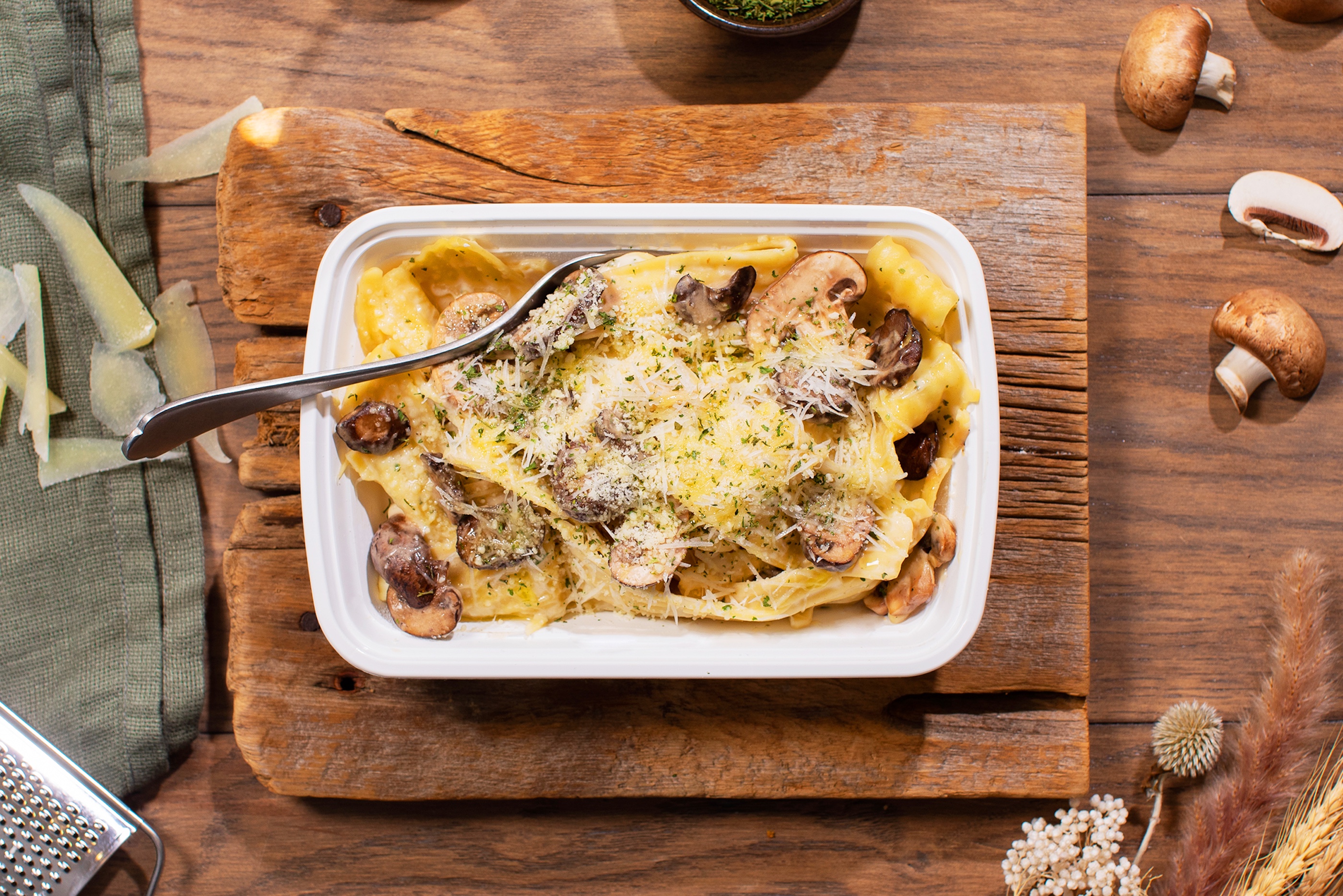Pasta Linguine, Mushrooms, Butter, Truffle Paste (Mushrooms, Sunflower oil, Breadcrumbs, Yeast, Salt, Truffle), Cream, Whole milk, Parmesan cheese, Vegetable stock, Parsley, Thyme, Oregano, Basil, Onion, Garlic, Olive oil, Salt, Peppercorn, Flour, Corn starch, Yeast extract, Sugar, Xanthan gum,