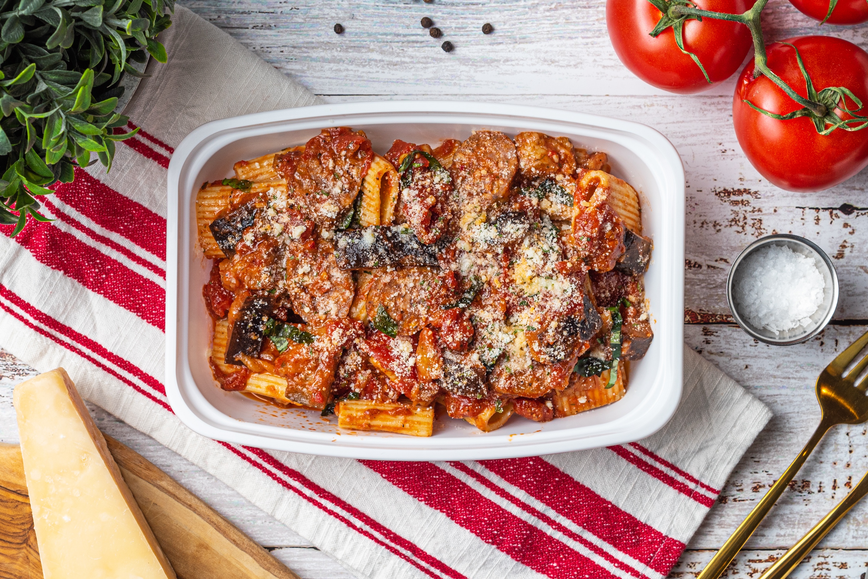 Roasted Eggplant and tossed with Italian sausage, rigatoni and a rich tomato basil marinara.