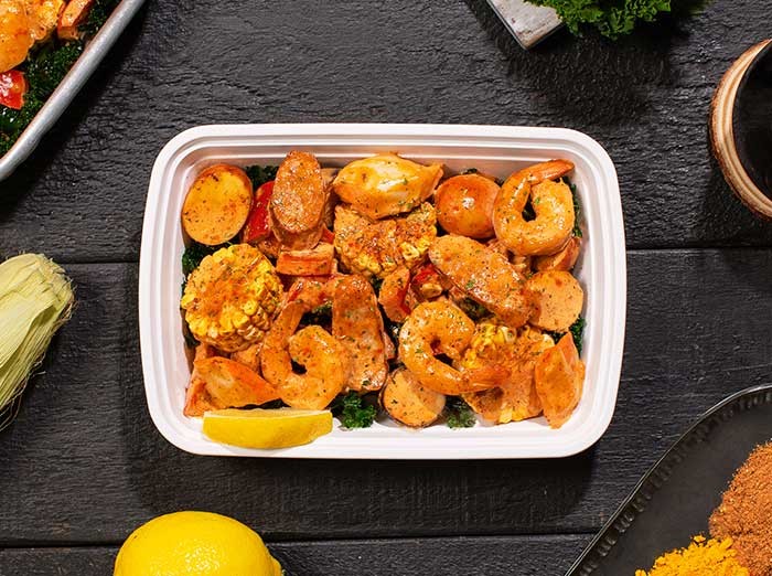 Shrimp, Sausage (Ground Pork, Fennel seeds, Anise, Thyme, Pepper, Salt, Nutmeg, Garlic), Surimi (Pollock, Water, Wheat, Egg, Soybean, Sugar, Salt, Calcium Carbonate), Ciabatta Bread (Unbleached enriched flour, Water, Sea salt, Canola oil, Yeast), Corn, Potato, Kale, Lemon, Sour cream, Butter, Flour, Garlic, Onion, Bell pepper, Scallion, Paprika, Chili powder, Celery salt, Sugar, Black pepper, Salt, Parsley.